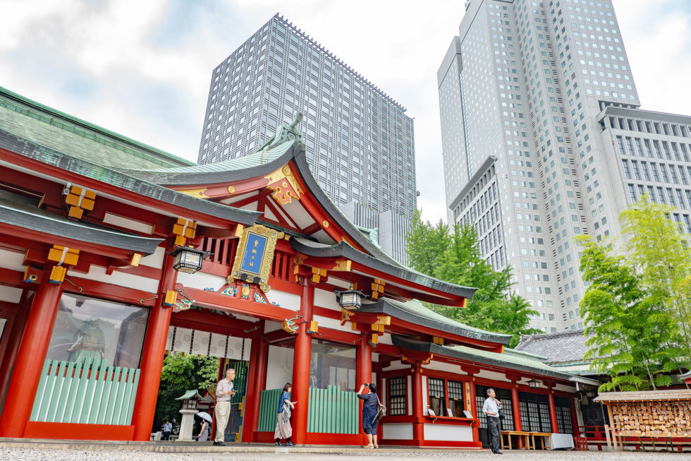 The Akasaka Hikawa Shrine surrounded by greenery.