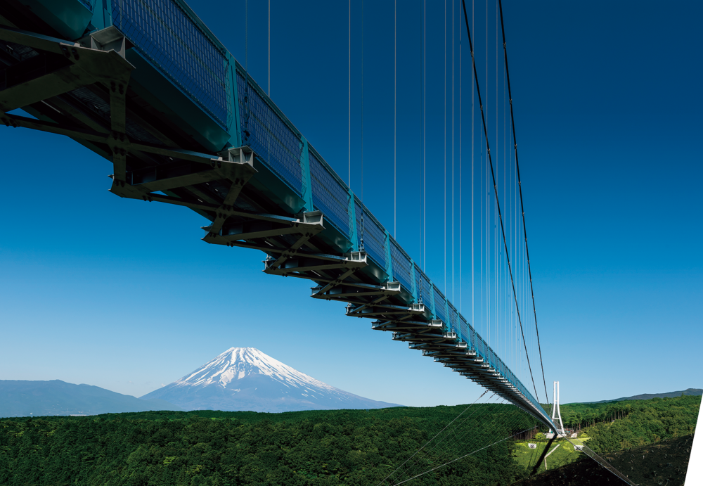 - No other tall mountains populate its vicinity, leaving views unobstructed from every angle, making for numerous locations to take in its beauty. One of those vantage points is Mishima Skywalk suspension bridge, Japan’s longest at 400 meters. During a season with good visibility, visitors can experience the striking figure of Mt. Fuji from close proximity. The popular panorama includes Japan’s highest mountain, longest suspension bridge, and sweeping views of one more spectacle in a class of its own: Suruga Bay, the deepest bay in the country. Cross over the bridge to enjoy an outdoor park designed to have a minimal impact on the environment while offering quiet woods to stroll in and adventurous activities for visitors.
