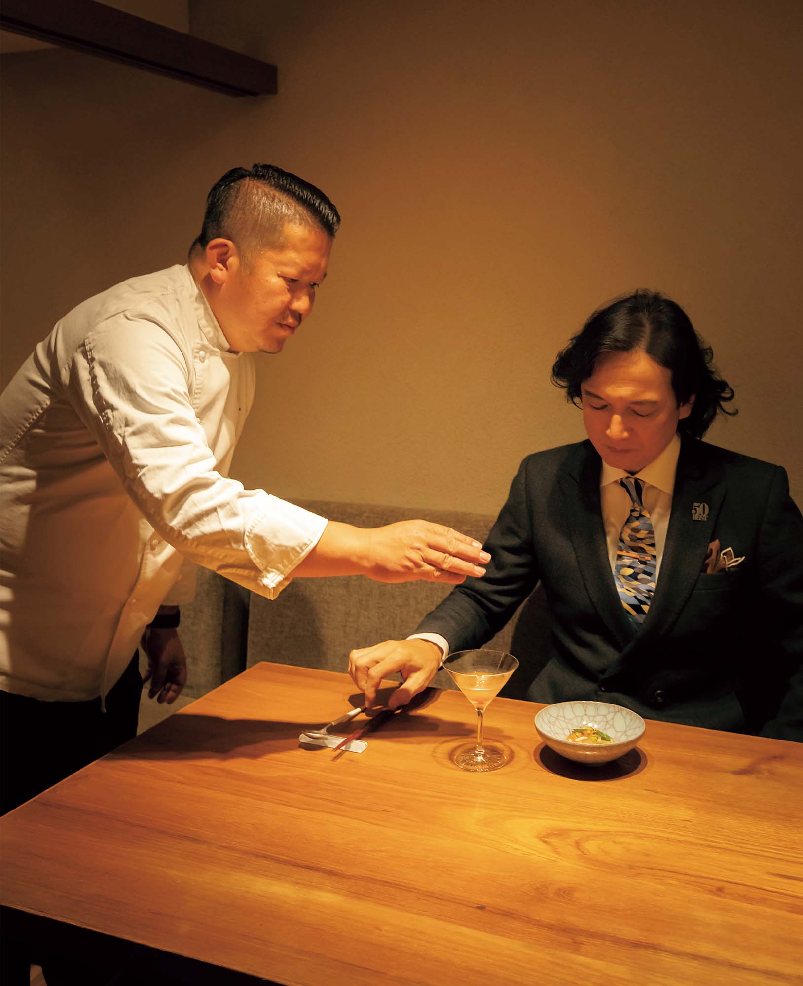 福山剛シェフ(左)のレストラン「ラ メゾン ドゥ ラ ナチュール ゴウ」で久保田農園のハーブと大分・湯布院のサーモンを使った料理を楽しむ中村さん(右)。ドリンクには、シャンパーニュと同じ製法で作られるクレマンロワールをカクテルグラスで。
