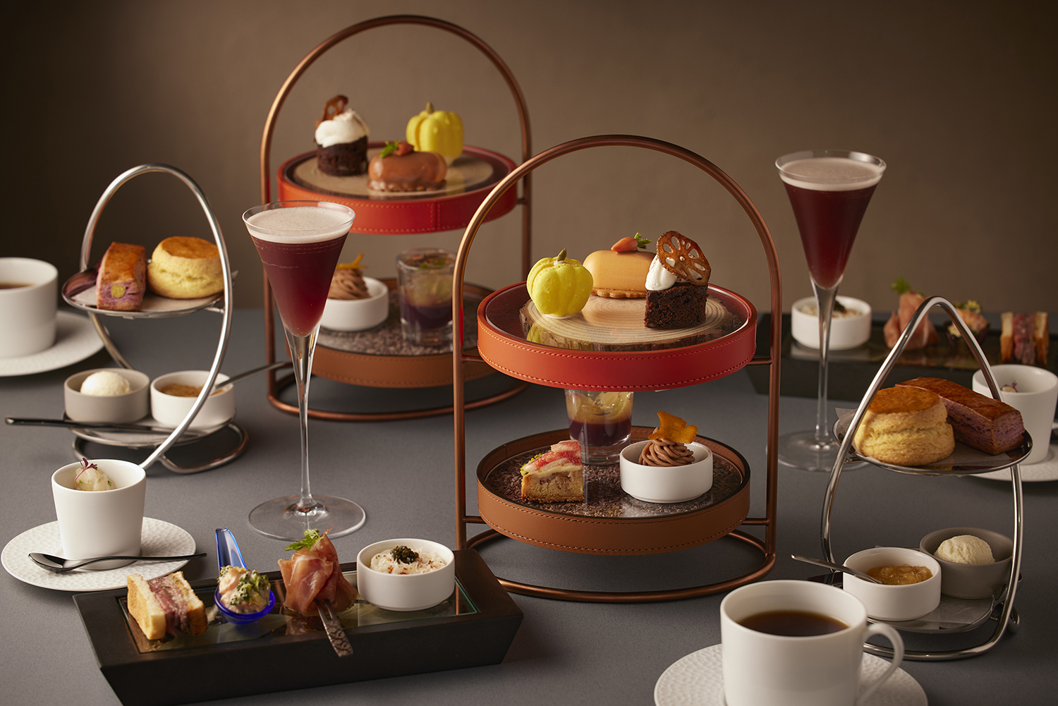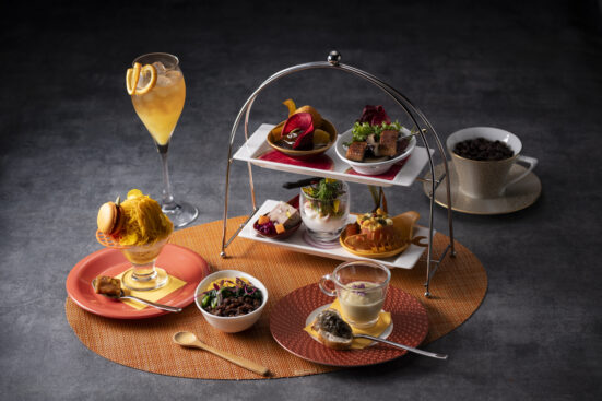 地上200mからの大パノラマを臨みながら、贅沢な午後のひとときをお過ごしいただけるBar Bellustarのアフタヌーンティー。充実のティーセレクションとともにご提供する秋のメニューは、セイボリーからスイーツ、そしてバーテンダーが考案するスペシャリティドリンクまで、実りの季節を隅々まで味わっていただける内容です。パティシエこだわりのスイーツは、葡萄や和栗など秋を代表する人気の食材をはじめ、かぼちゃ、蓮根、人参などの野菜を見た目も愛らしい秋色スイーツの数々に仕上げ、セイボリーやアミューズにも旨みや甘さが凝縮した秋の旬をたっぷりとお召し上がりいただきます。季節のスペシャリティドリンクは、秋にふさわしい深みのある味わいの黒烏龍茶と葡萄のモクテルをご用意いたします。