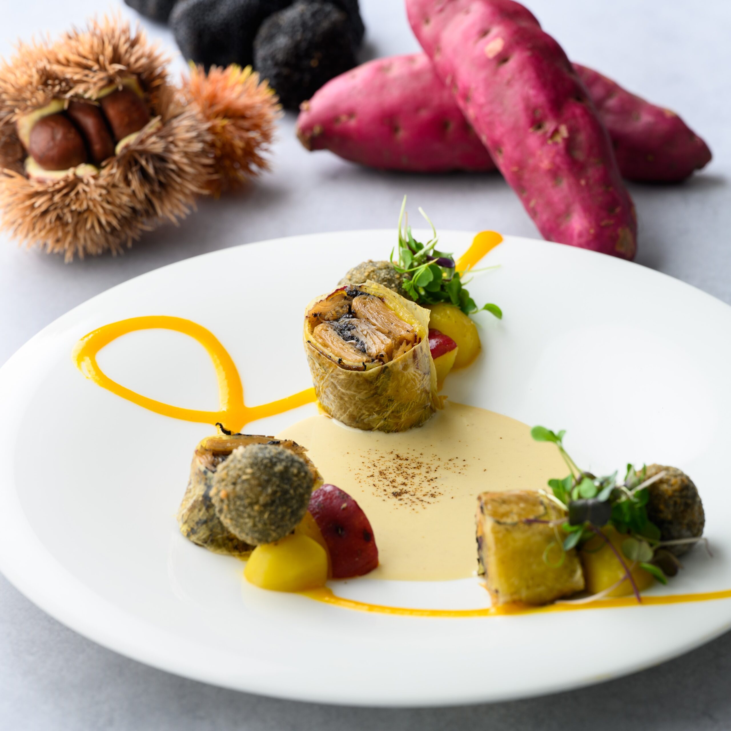 大豆ミートの一種・ライクチキンとトリュフを巻き込んだゴージャスなバロティーヌに仕上げました。旬の栗と地元産の五郎島金時を煮込んだフリカッセに、15種類の穀物を合わせたクロケットも添えて、体に優しく、心満たされる一皿です。