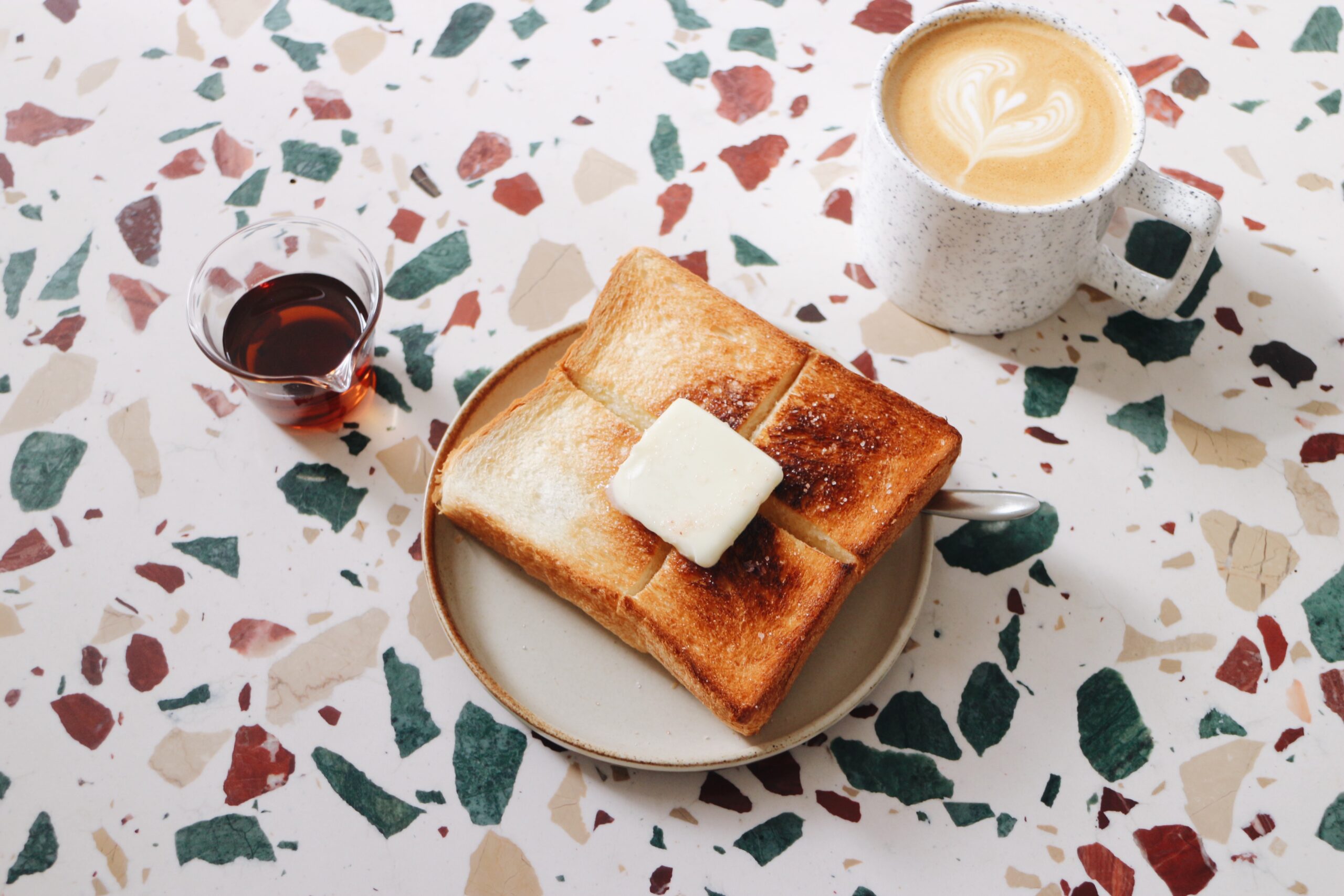 モーニングから提供している人気メニュー「バタートースト」は、発酵バターを中に染み込ませ、表面をカリッと焼き上げた厚切りのトーストだ。