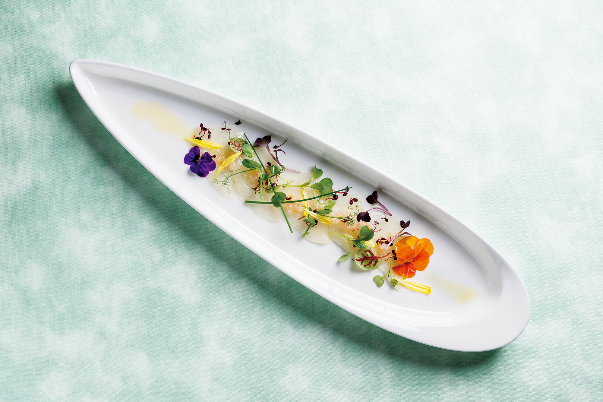 皿に流れるように並べられた、旬の“桜鯛”の薄造り。昆布で旨みを引き出し、柚子の皮とエシャロットを合わせたビネグレットが清々しい香りを添える。