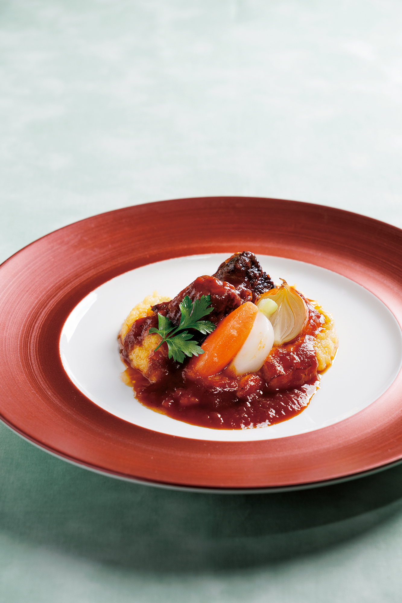 フランスの伝統的な家庭料理「ナヴァラン」をアレンジした、ラムすね肉とカブの煮込み。トマトとフォン・ド・ボーで4時間ほどじっくりと火を入れたやわらかなラムを、ポレンタ(粥状に煮たコーンミール)といただく。