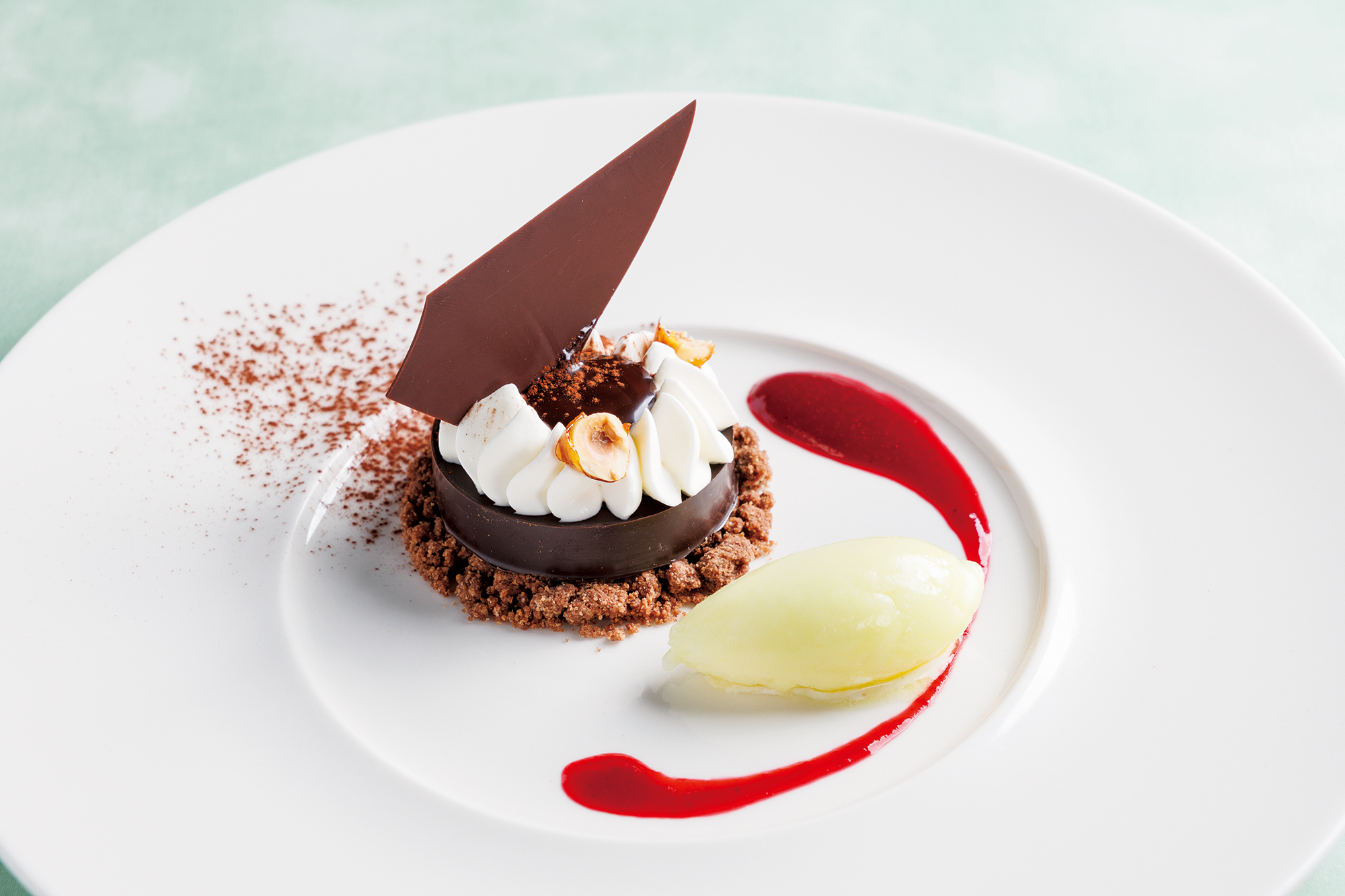 しっとりと仕上げたガトーショコラに、香ばしいシュトロイゼル、生クリーム、チョコレートソースを重ねた多層的なスイーツ。ベリ ーソースの酸味と、旬の日向夏を使ったソルベが溶け合い、甘い余韻を残すひと皿に。