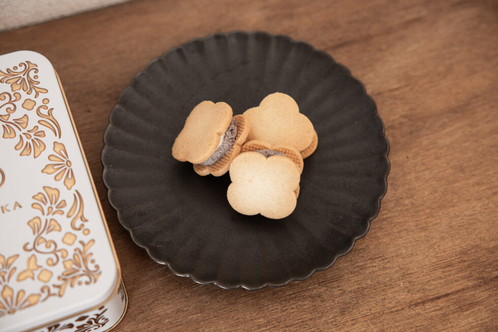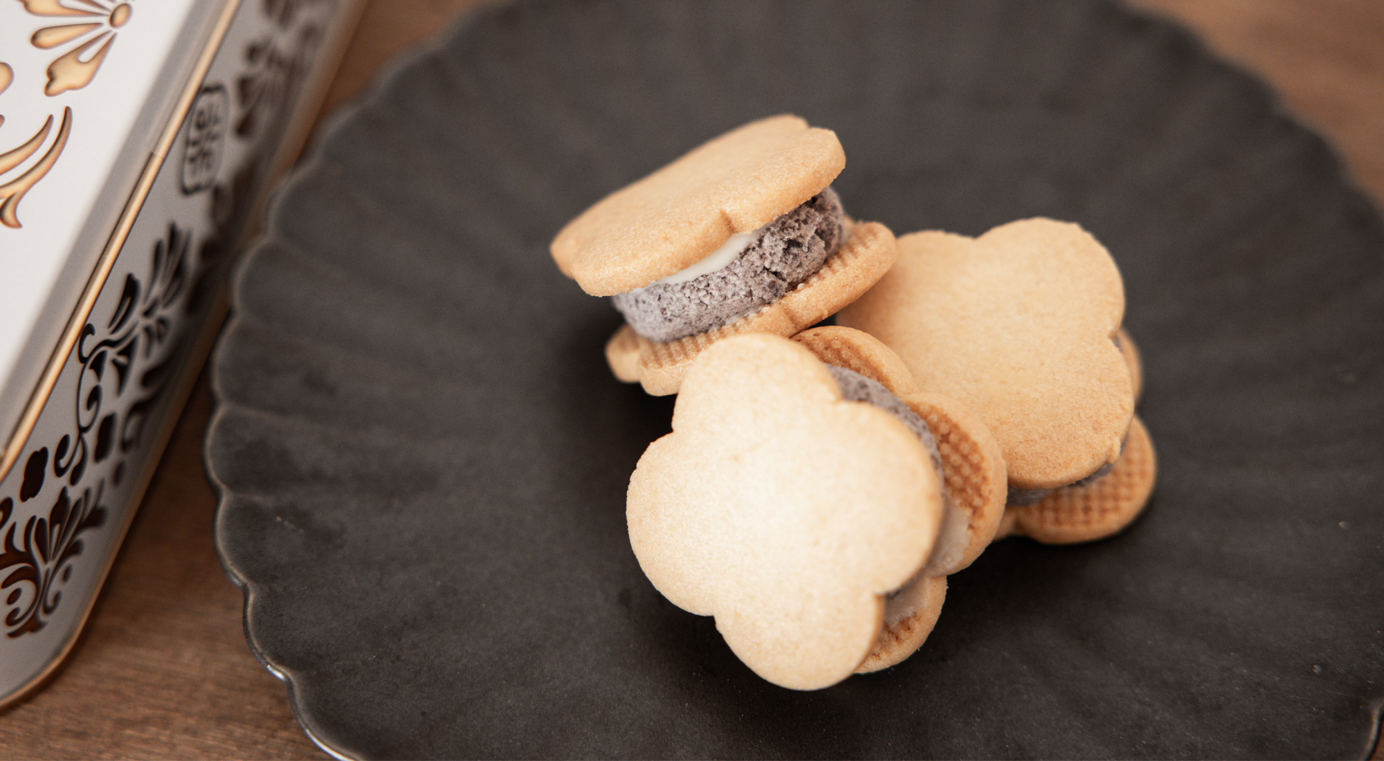 - 北海道産あずきの甘納豆を粉末にし、さらに粒のままのあずき甘納豆を加えたクリームを、フランス産カマルグの塩を隠し味に使用したサブレでサンド。黒ごまパウダーが和の風味を深め、塩味がほんのりと甘さを際立たせる。和と洋が見事に調和した、MIYUKAならではの味わいだ。