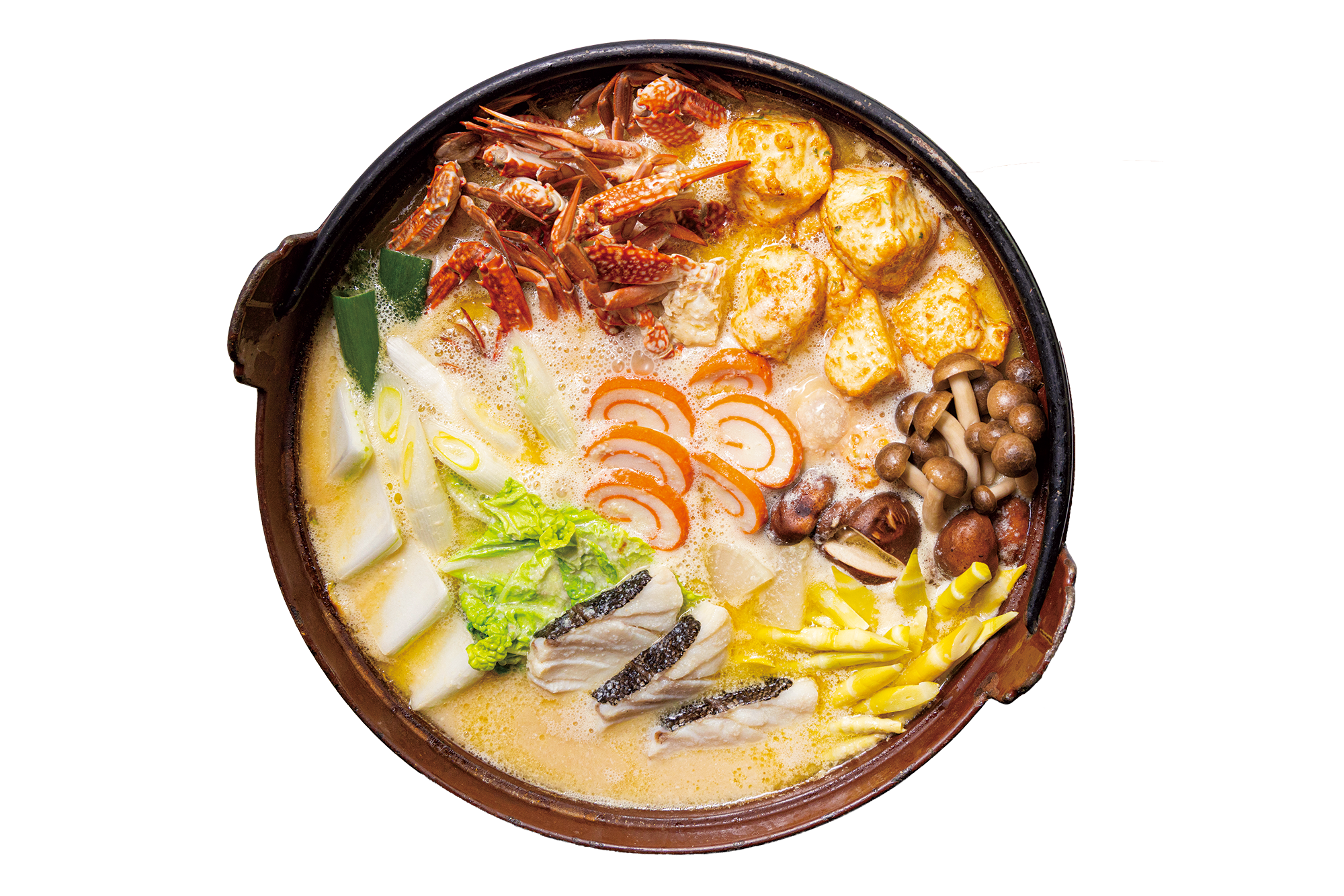 東料理長のアイデアが詰まったキュイジーヌ- 体を芯から温めてくれる海鮮鍋は味噌仕立てで、昆布だしに富山の銘酒から作られた酒粕がたっぷり。クリーミィでなめらかな味わいに。具には魚介類や野菜と共にすり身揚げや赤巻きか まぼこも加わり、ボリュームも満点。隠し味にバターが使われているので、洋食メニューにもよく合う。