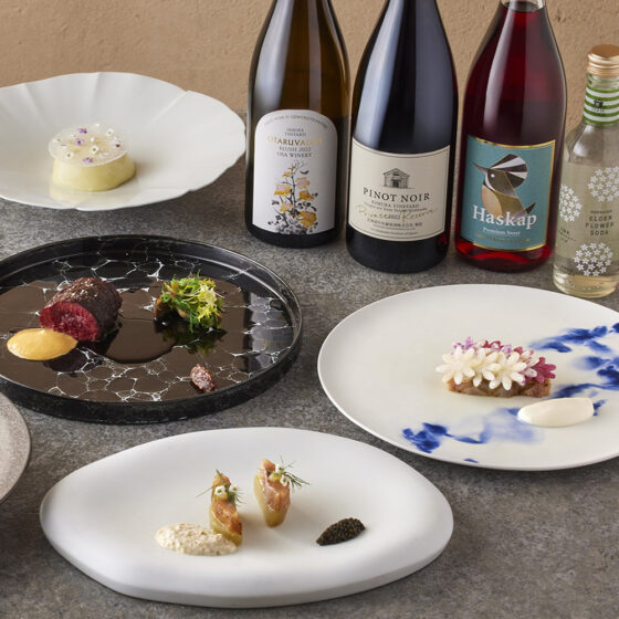 能作社長 能作千春氏がセレクトした、「若鶴酒造」のお酒4種類とのマリアージュを楽しめるセットもご用意。料理とお酒、錫の器が輝き合う、上質なひとときをお楽しみください。 -