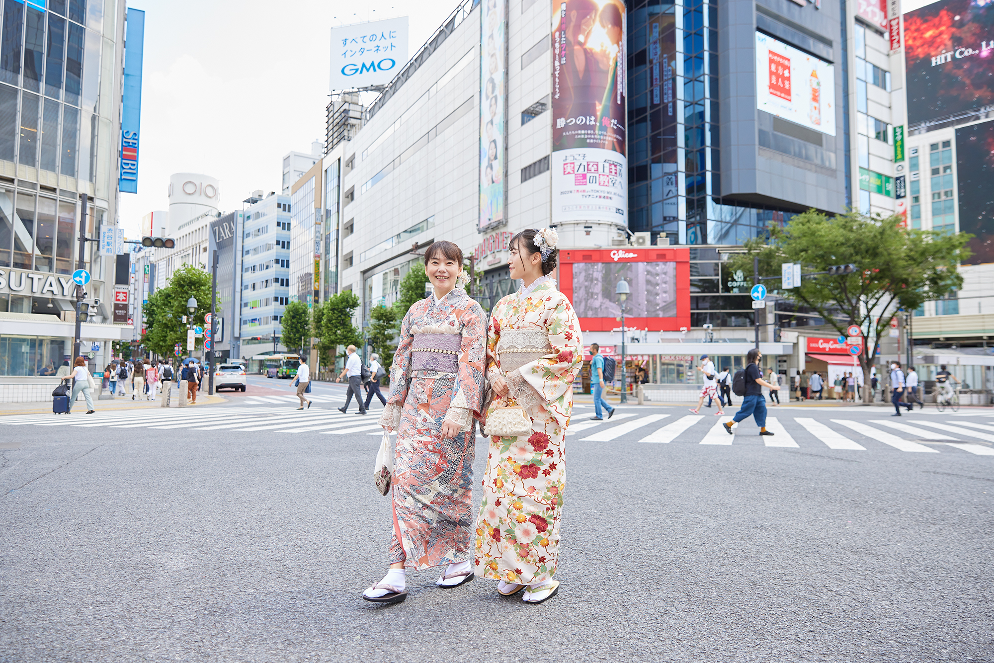友人やカップル(男性も和装レンタル可)で渋谷の街をそぞろ歩きも一興だ。