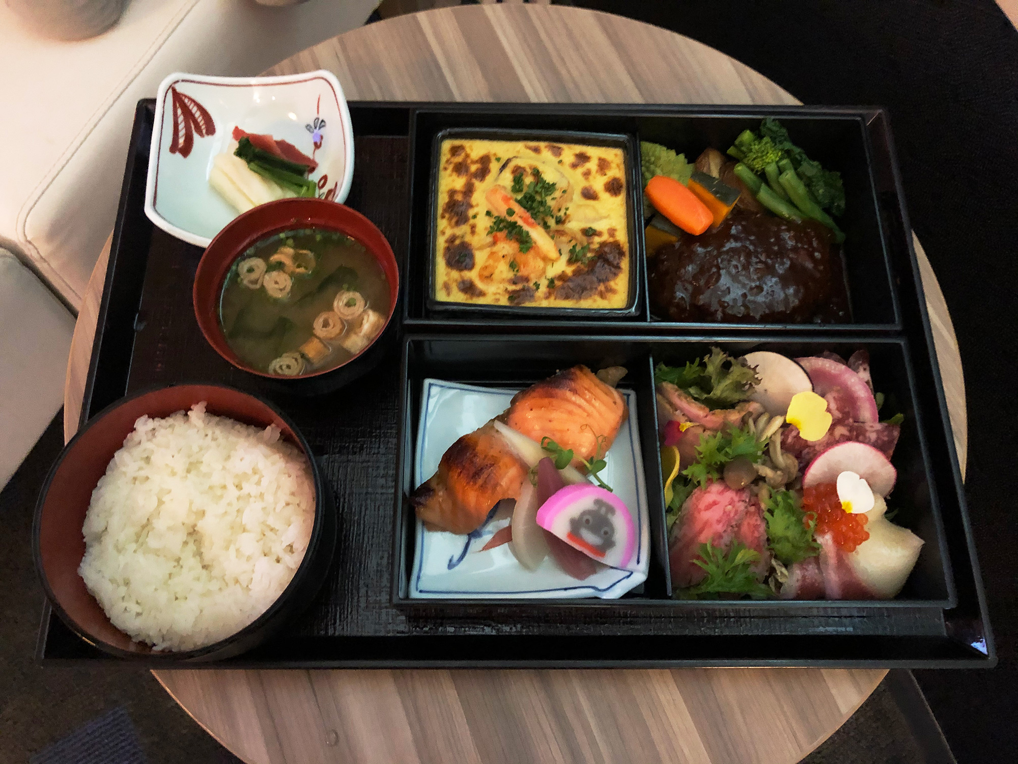 •5種のオードブルとサラダバリエーション 東急線キャラクター「のるるん」カマボコ添え •ごはん/漬物/お味噌汁