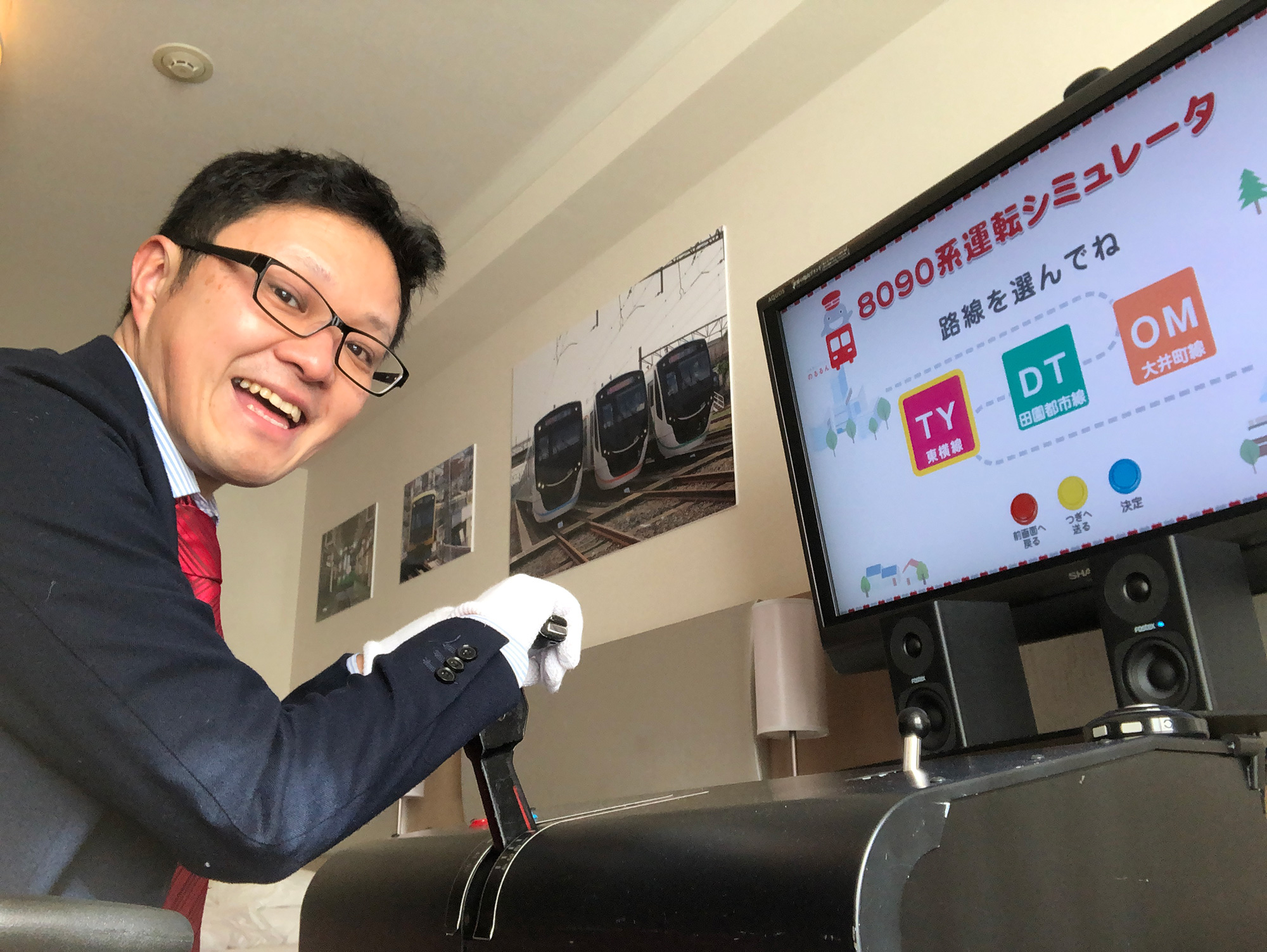 上品な調度品の中にドーンとシミュレーターが鎮座しており、壁には東急の電車たちの写真が飾られています。