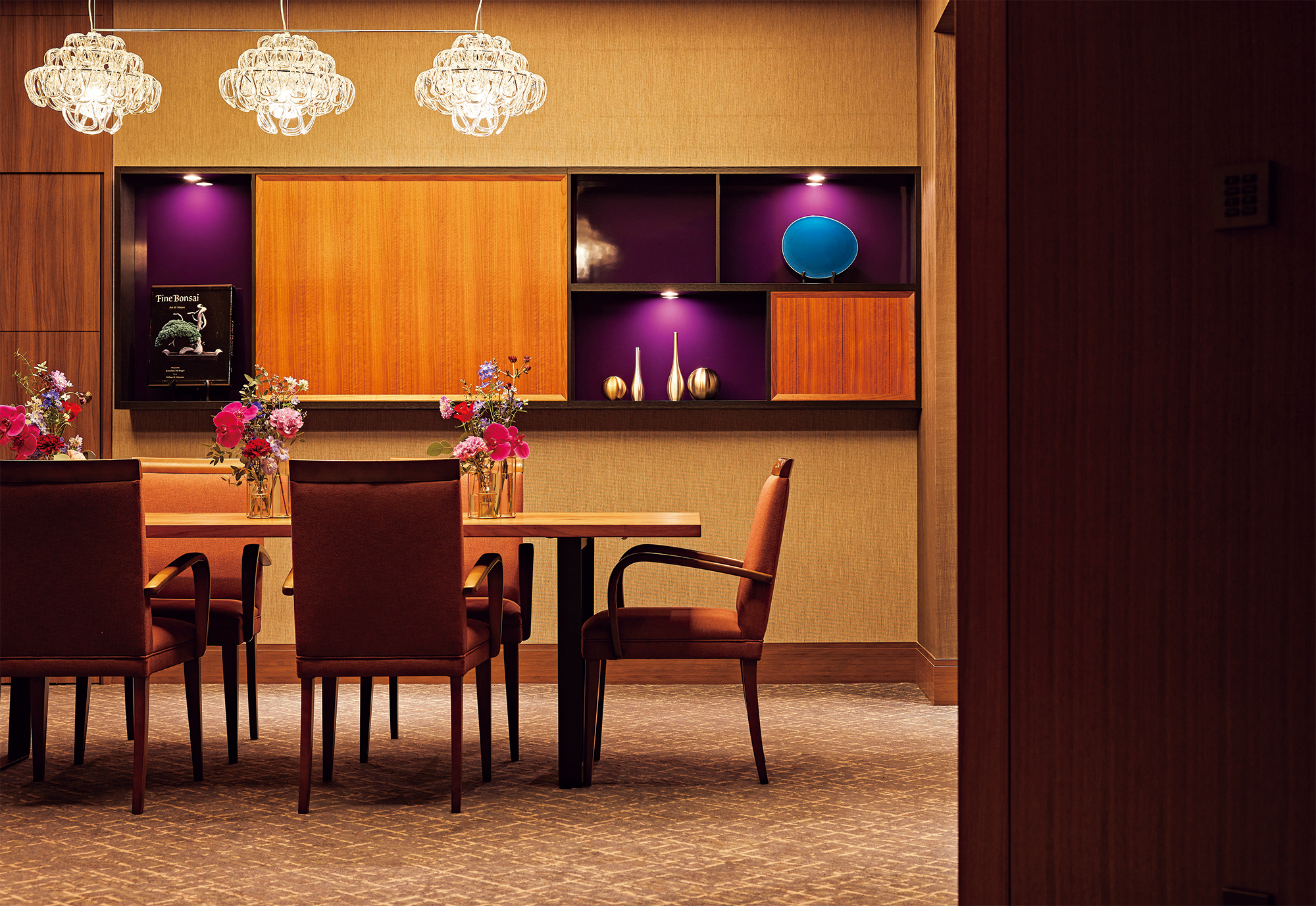 - セルリアンタワー東急ホテルは、モダンでアーティスティックなデザインの中に、巧みに和の意匠や肌触りが織り込まれ、海外からのゲストを魅了するだけでなく、私たち日本人の感性にも響くものがある。落ち着いた空気感が漂うこのダイニングルームにも、それが確かに表れている。