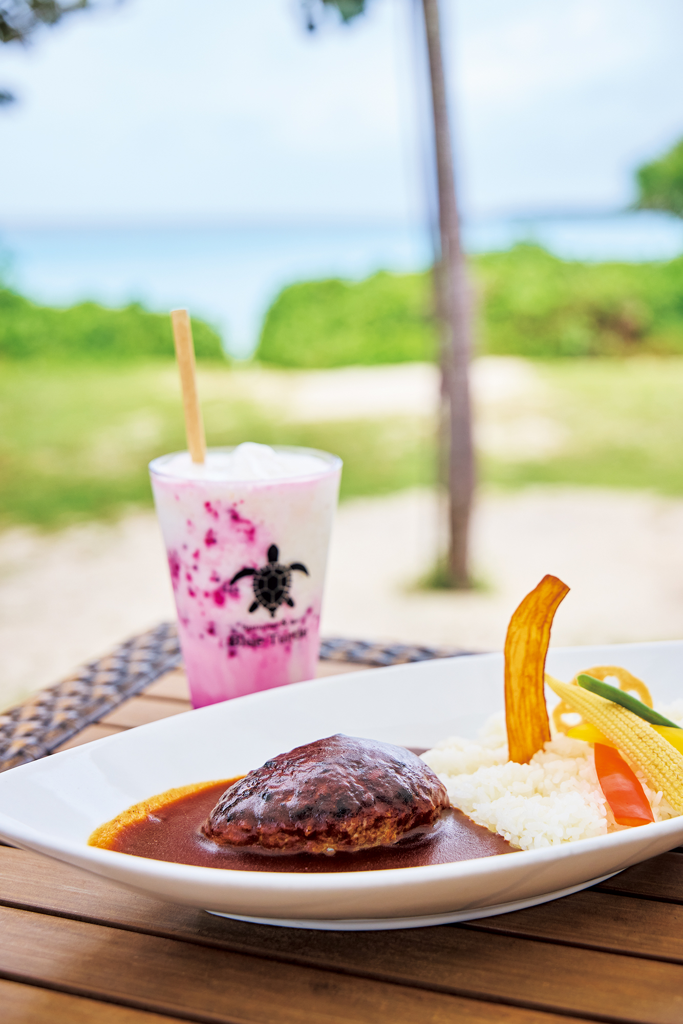 伊良部島にある、オーシャンビューのレストラン&バー「ブルータートル」。テラスの向こうには、弧を描いた白い砂浜の「渡口の浜」が広がる。人気メニューは16種類のスパイスで仕上げた「宮古牛ハンバーグカレー」と、すっきりとした味わいの「ドラゴンフルーツバナナスムージー」。