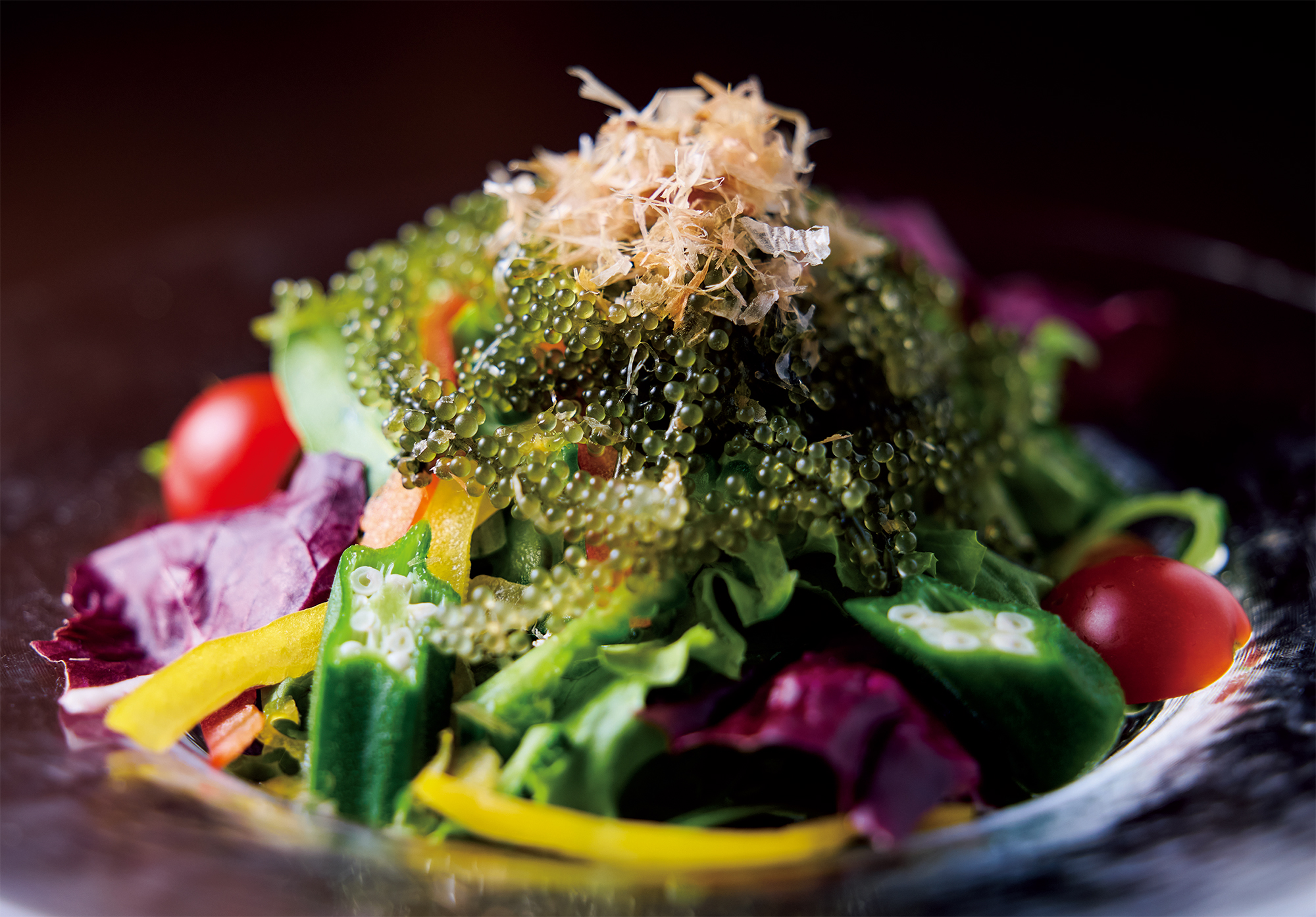 「海ぶどうと島野菜サラダ」は、宮古の海と大地を味わうひと皿。