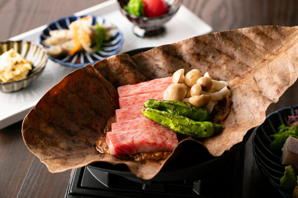 飛騨牛のとろけるような上品な旨みがたまらない夕食のメインは、「朴葉味噌焼き」「ステーキ」「すき焼き」から選べる。