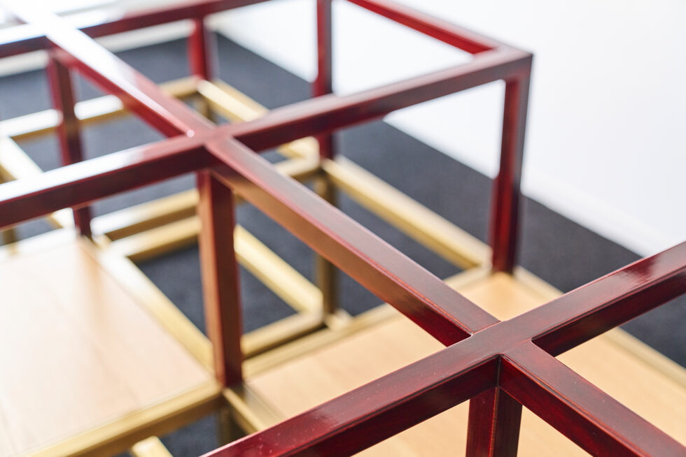 ロビーのある吹き抜けの1階は、伝統工芸を取り入れつつもモダンな印象。
